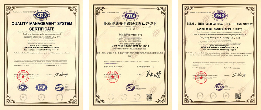 赵钱服饰有(yǒu)限公(gōng)司将优秀的设计生产(chǎn)化作(zuò)企业自身的追逐信仰,在选料上精(jīng)益求精(jīng),在设计上考究全面,在生产(chǎn)上一丝不苟,企业先后通过《质(zhì)量管理(lǐ)體(tǐ)系认证》《职业健康安(ān)全管理(lǐ)體(tǐ)系认证》《环境管理(lǐ)體(tǐ)系认证》等多(duō)个认证资质(zhì),以做让各界人士放心的合作(zuò)伙伴。